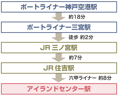 神戸空港駅 → ポートライナー(約18分) → 三宮駅(終点)下車 → 乗り換え → JR 三ノ宮 (徒歩2分) →普通・快速 → JR 住吉 (約7分) 下車 → 乗り換え → 六甲ライナー(約8分) → アイランドセンター駅下車(徒歩1分)