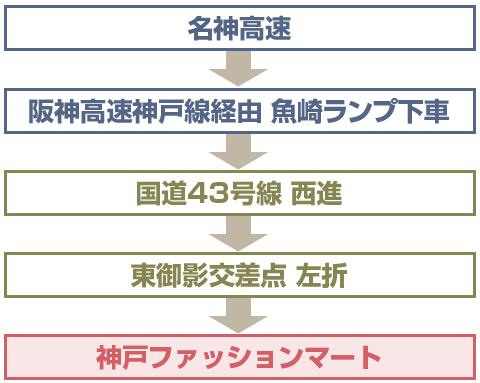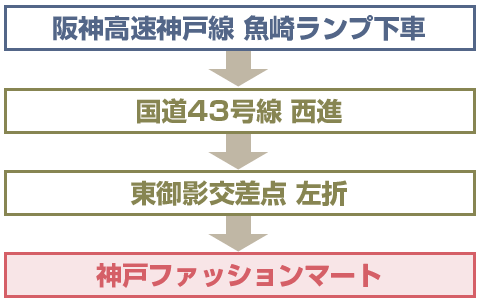 阪神高速 神戸線魚崎ランプ下車 → 国道43号線西進 → 東御影交差点左折(約10分)