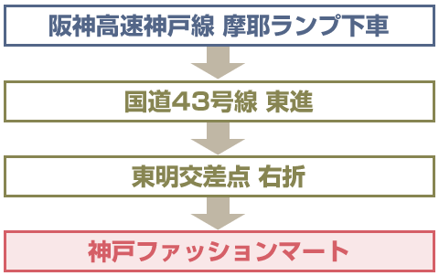 阪神高速神戸線摩耶ランプ下車 → 国道43号線東進→東明交差点右折(約10分)