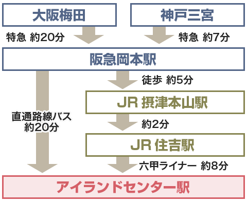 - 阪急岡本駅 (梅田駅より約20分、神戸三宮駅より約7分、全種類停車) 下車 → 乗り換え → JR 摂津本山駅(徒歩5分) → 普通 → JR住吉駅 (約2分) 下車 → 乗り換え → 六甲ライナー(約8分) → アイランドセンター駅下車(徒歩1分)