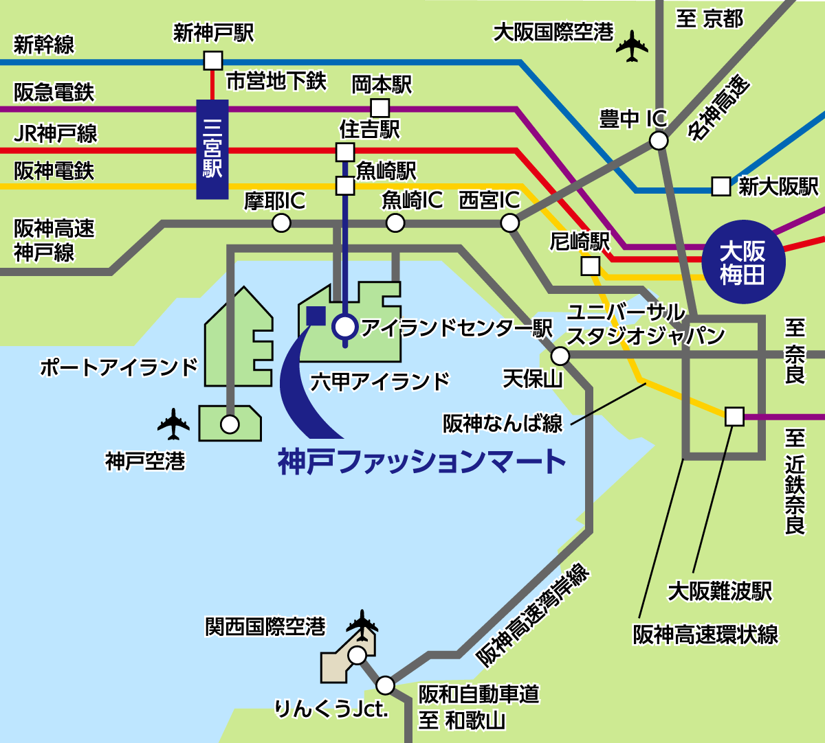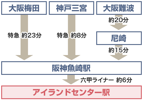 阪神魚崎駅 (梅田駅より特急で約23分、神戸三宮駅より特急で約8分、大阪難波より尼崎経由約35分、普通・準急・特急・直通特急停車) 下車 → 乗り換え → 六甲ライナー(約6分) → アイランドセンター駅下車(徒歩1分)