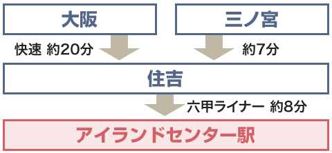 JR住吉駅 (大阪駅より快速で約20分、三ノ宮駅より約7分、普通・快速停車) 下車 → 乗り換え → 六甲ライナー(約8分) → アイランドセンター駅下車(徒歩1分)
