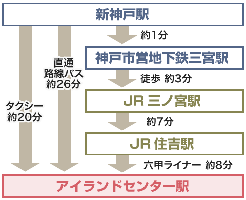 - 新神戸駅 → 神戸市営地下鉄三宮駅 (約1分) 下車 → 乗り換え → JR 三ノ宮 (徒歩3分) → 普通・快速 →JR住吉 (約7分) 下車 → 乗り換え → 六甲ライナー(約8分) → アイランドセンター駅下車(徒歩1分)
