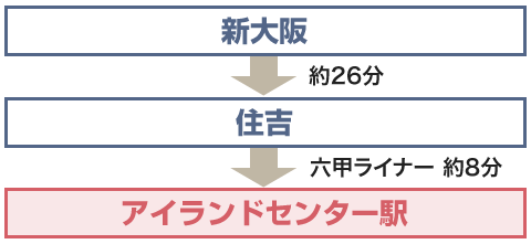 新大阪駅 → 普通・快速 → JR 住吉駅 (約26分) 下車 → 乗り換え → 六甲ライナー(約8分) → アイランドセンター駅下車(徒歩1分)